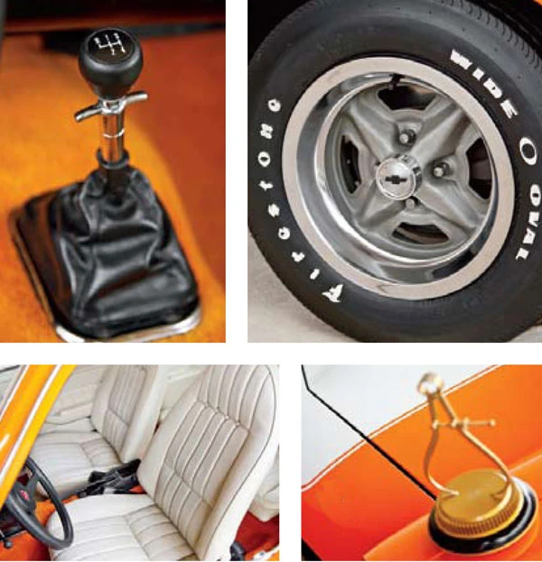 The 1,000,000 Vega has a orange orange paint exterior, a light vinyl custom interior, white stripping, and a special decal in the door handles.